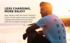 - 22-HOURS OF MUSIC – Enjoy 6 hours of battery on a single charge and 22 hours total with the included portable charging case.