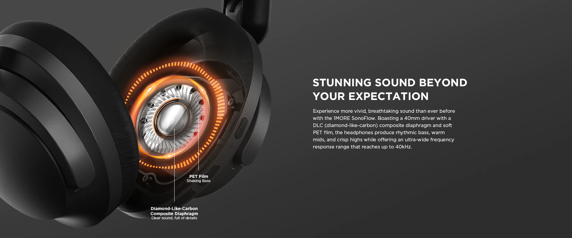 - Wireless Audiophile Sound: certified by Hi-Res Audio and Hi-Res Audio Wireless, 1MORE SonoFlow features 40mm DLC dynamic driver to produce stunning sound and its frequency response can reach up to 40kHz.