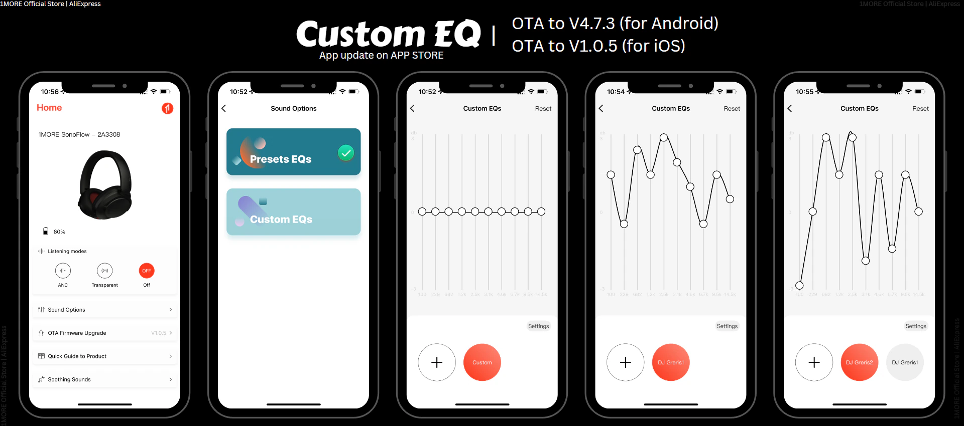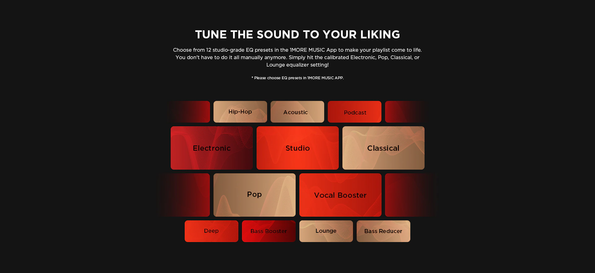 - Adjustable EQ Settings: Choose from 12 studio-grade EQ presets in the 1MORE MUSIC App to make your playlist even more enjoyable. Simply tap the calibrated Electronic, Pop, Classical, or Lounge equalizer setting!