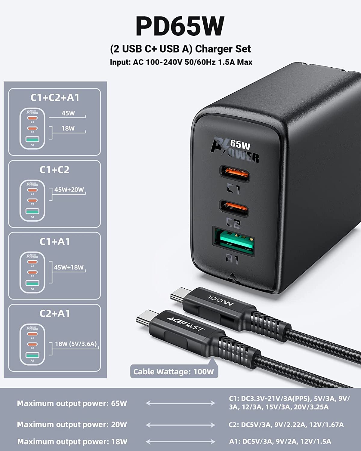 • Fast Charger Set Includes One 100W USB C to USB C Charging Data Cable. ACEFAST PD65W 3 port fast charger comes with a 6.6ft USB C to USB C 100W max fast charging data cable. Charge USB C charging port laptop in full speed. The USB C to USB C charging data cable is built-in E-marker chip, intelligently adjust current and voltage to ensure stable power, support charging speed up to 20V/5A. With USB 2.0 it can transfer data while fast charging USB C device, high speed transfer data up to 480Mbps.