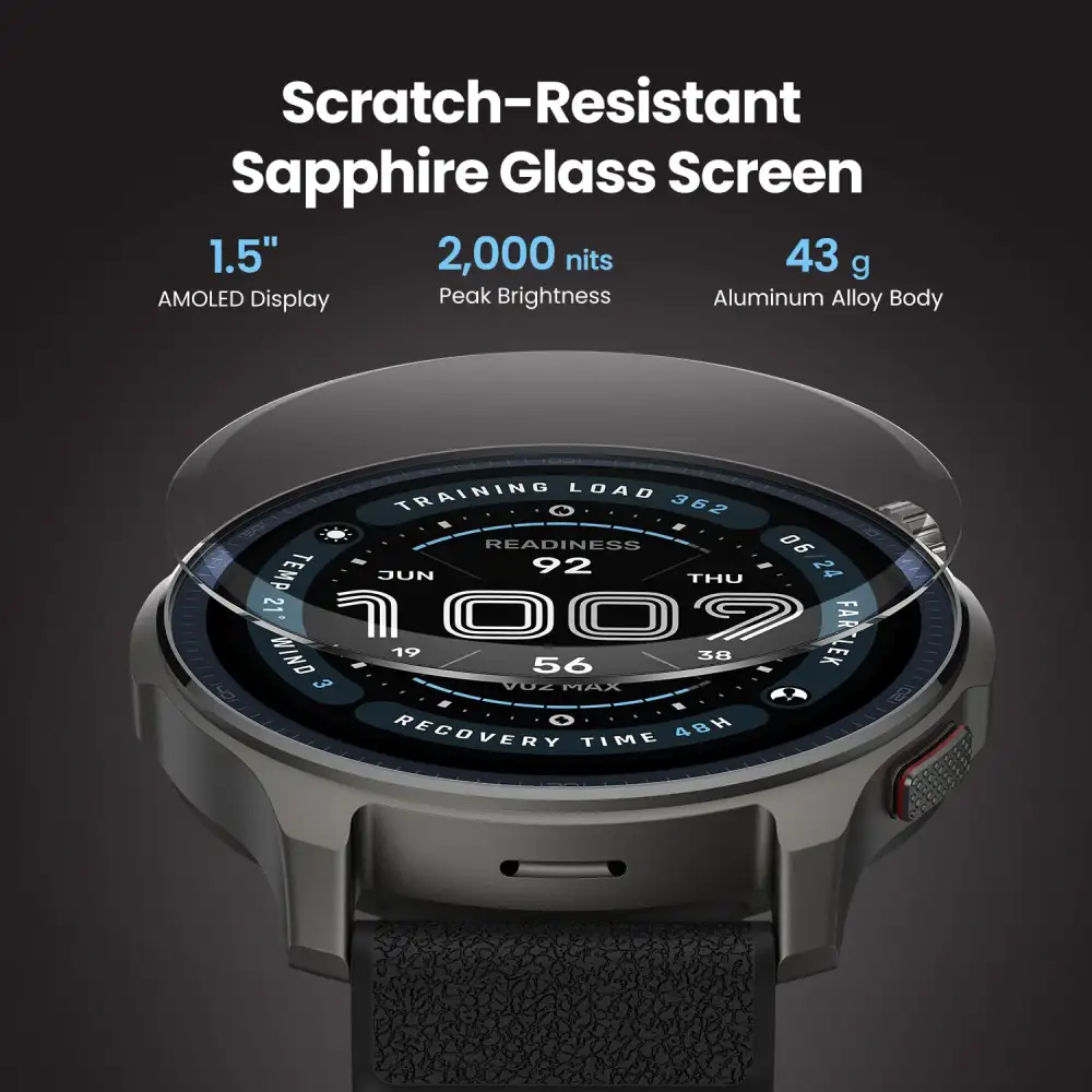 Display: 1.5″ AMOLED, 480×480 resolution, ~323 PPI, up to 2000 nits brightness, sapphire glass