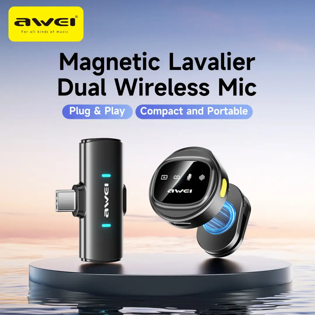 - The Awei MK3 Magnetic Lavalier Dual WirelessMicrophone is a modern audio solution designed for creators who demand professional sound without the hassle of cables. Whether you are recording interviews, producing YouTube videos, hosting podcasts, or streaming live content, this dual wireless system helps you capture clear and balanced voice output with ease. Moreover, its compact design makes it ideal for both indoor and outdoor recording.