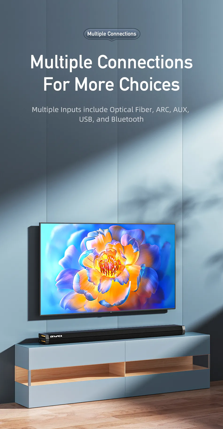 - The Awei Y990 100W Dual Speakers Home Theater TV Sound Bar stands out as a fashionable and technologically advanced audio companion for your television, delivering a captivating auditory experience. With its sleek design and surging sound quality, it seamlessly integrates into your home entertainment setup, offering an immersive soundstage that enhances your overall viewing pleasure.