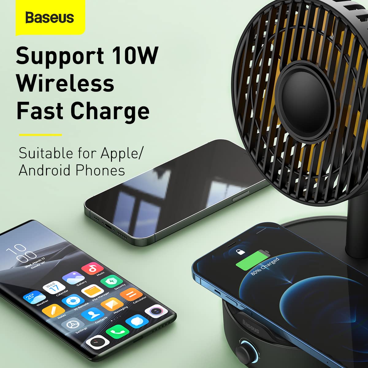 - In addition, the Baseus BS-W513 Fan also functions as a wireless charger for smartphones. It supports wireless charging for both iPhone and Android devices with 7.5W and 5W output power.