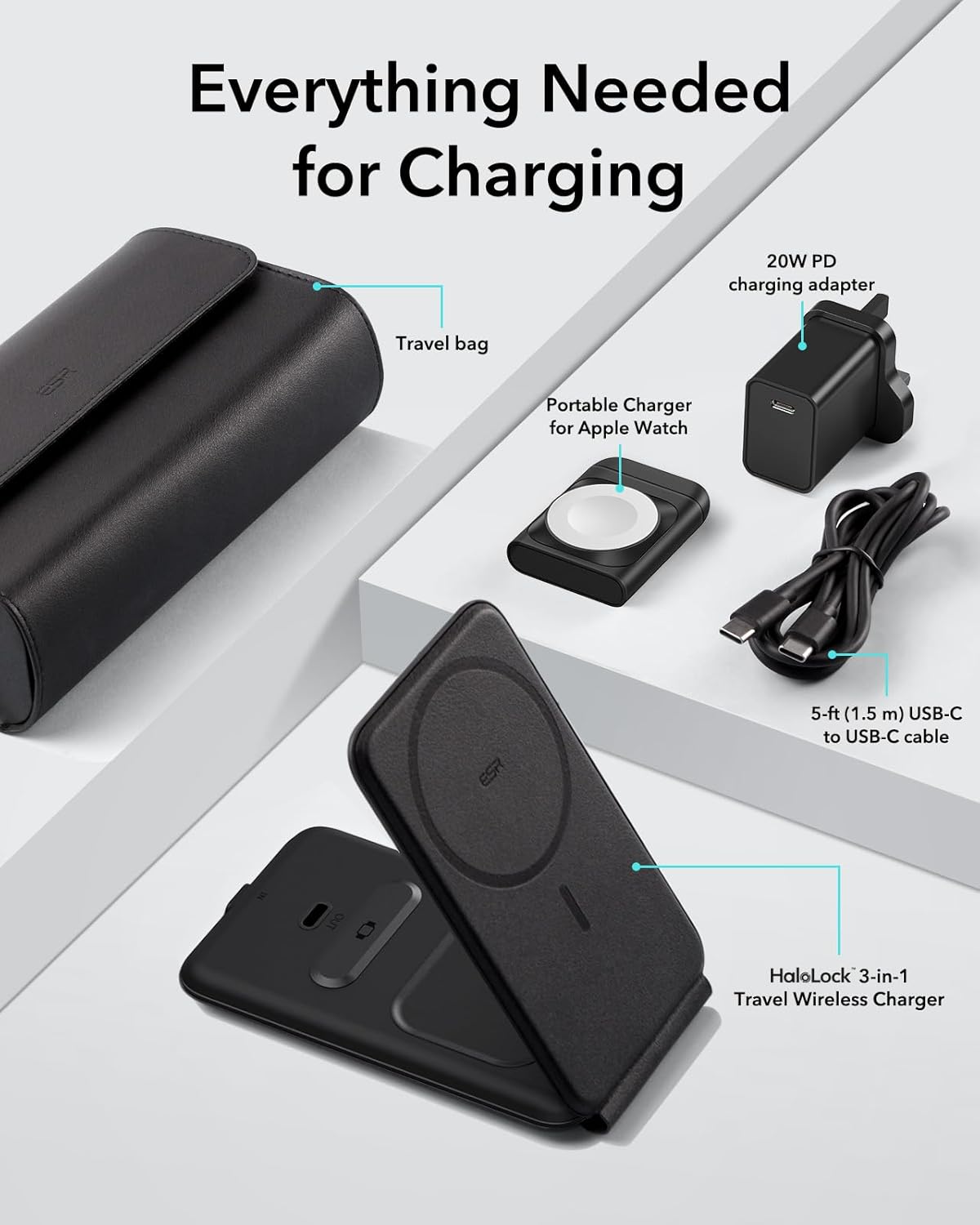 - Stay charged and organized with the ESR 3-in-1 Travel MagSafe ChargingStation, a must-have accessory for Apple users who value convenience, speed, and portability. This compact yet powerful charging solution is designed to simultaneously power your iPhone, Apple Watch, and AirPods – all in one sleek foldable station. Whether you’re on the go, at work, or at home, it offers a clutter-free charging experience.