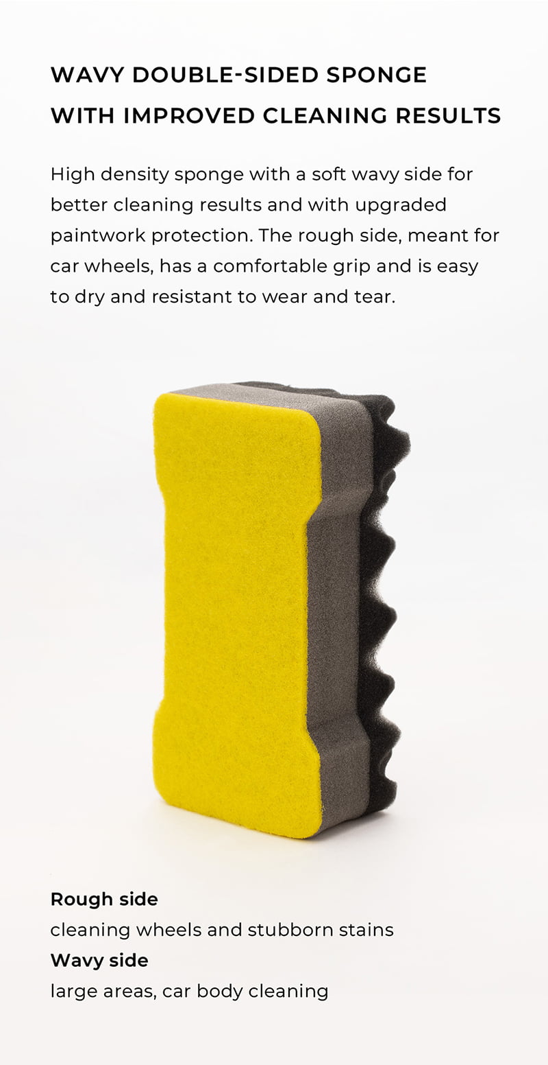 - WAVY DOUBLE-SIDED SPONGE: High-density sponge (8″x0.43″x3″) with a soft wavy side for better cleaning results and upgraded paintwork protection. The rough side, cleaning wheels, and stubborn stains. The wavy side, large areas, car body cleaning.