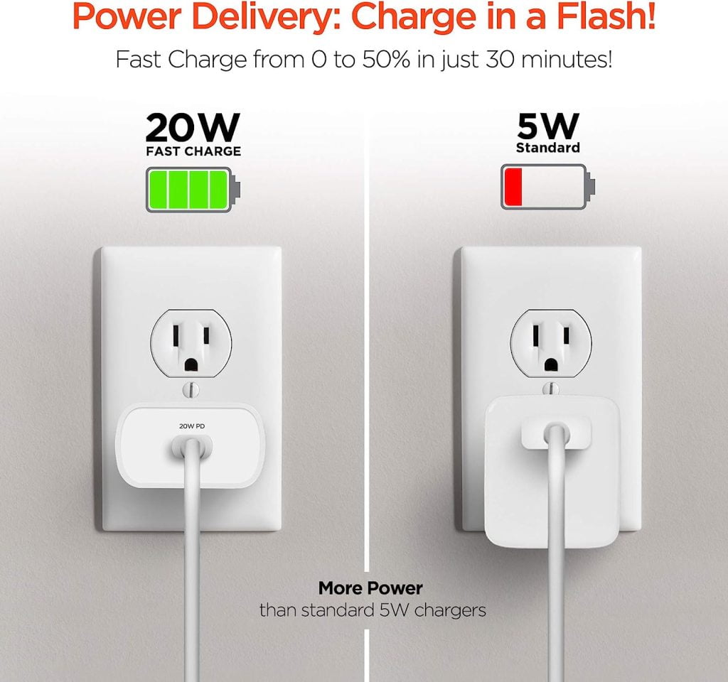 - Compatible with iPhone & Android Fast Charge: The super fast 20W PD output will fast charge compatible phones from 0 to 50% in just 30 minutes! That’s up to 3X Faster than with an original 5W charger!