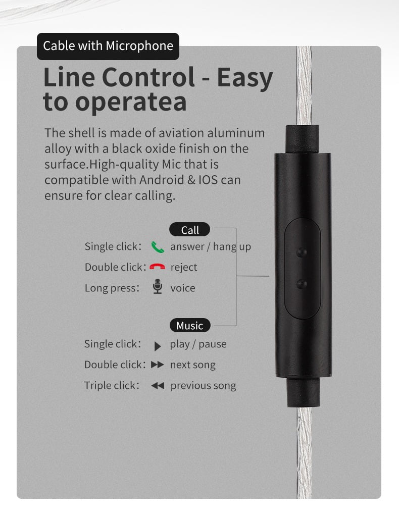 - Line Control and Microphone: The microphoned version is compatible with Android & IOS with high-quality Mic and smart control. In call mode, you can press once to answer/hang up and press twice to reject calls, while press and hold will allow you to input voice. In Music mode, you can easily switch to the next or previous song with double click or triple click, and pause or resume play with one click.