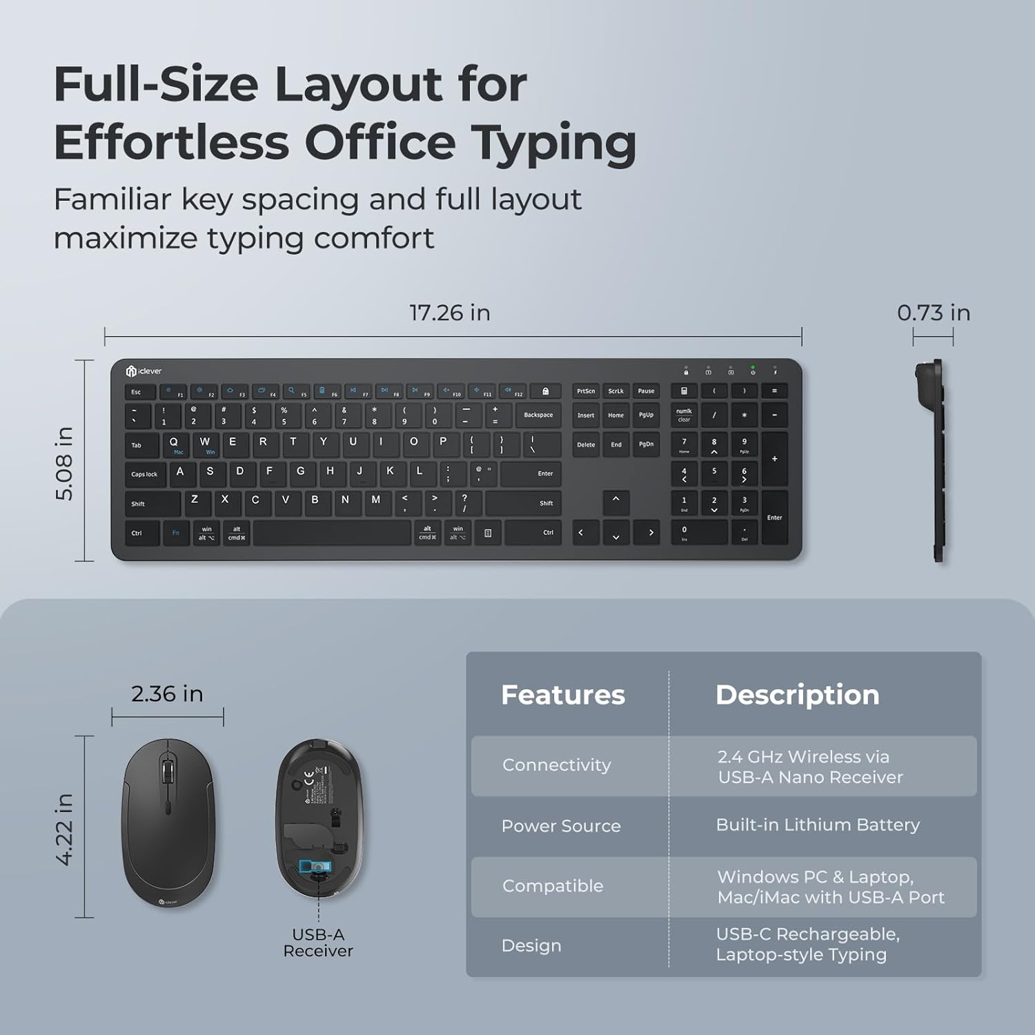 - One of the standout features of the iClever GK08 WirelessKeyboard and Mouse is its USB-C rechargeable design. Instead of using disposable AA batteries, both the keyboard and mouse can be fully charged within just 2 hours using the included USB-C cable. Once charged, they can last up to 45 days, which not only saves money but also supports an eco-friendly lifestyle.