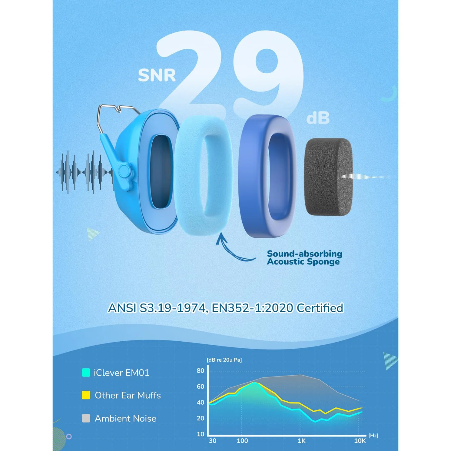- One of the key strengths of the iClever IC-EM01 Noise Reduction EarMuffs is their exceptional noise reduction performance. After extensive testing, iClever engineers combined a 22mm porous sound-absorbing sponge with a custom honeycomb acoustic sponge. As a result, the ear muffs achieve an impressive SNR of 29dB, with noise reduction reaching up to 46dB in certain scenarios. However, it is important to note that no ear muffs can completely block all noise.