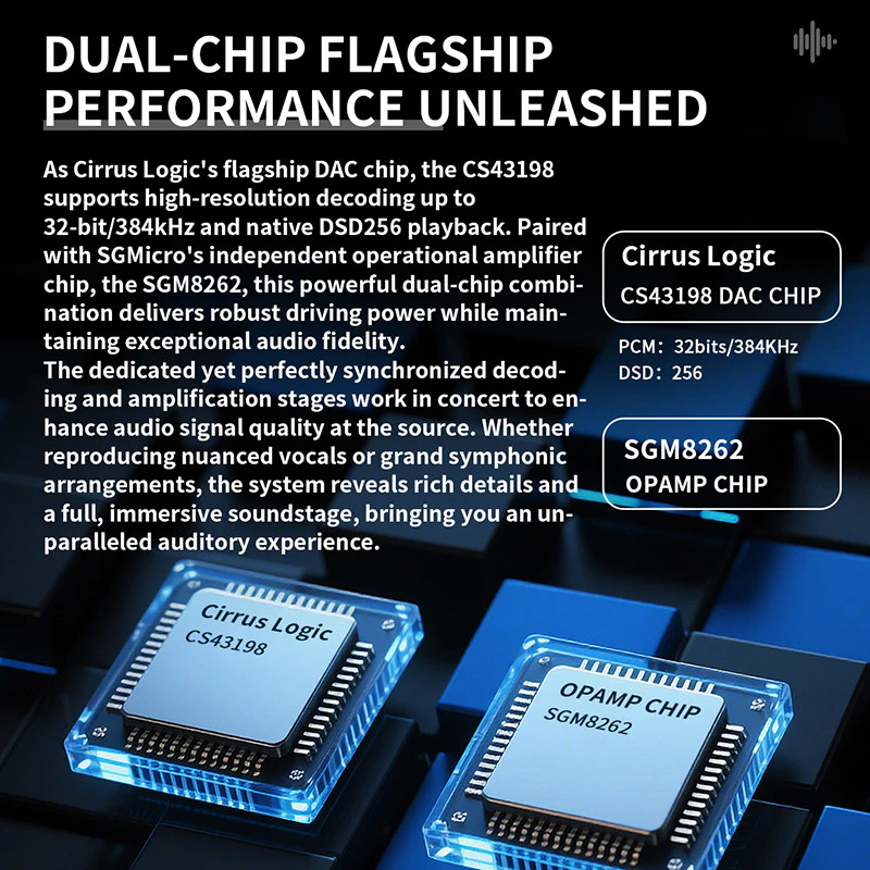 - At its heart lies Cirrus Logic’s flagship DAC chip, the CS43198, which supports 32-bit/384kHz high-resolution decoding and native DSD256 playback. This means you can enjoy studio-quality sound anywhere, anytime. Working alongside the SGMicro SGM8262 operational amplifier, the JCALLY JM98 MAX achieves perfect synchronization between decoding and amplification, producing powerful, distortion-free sound that remains true to the original recording.
