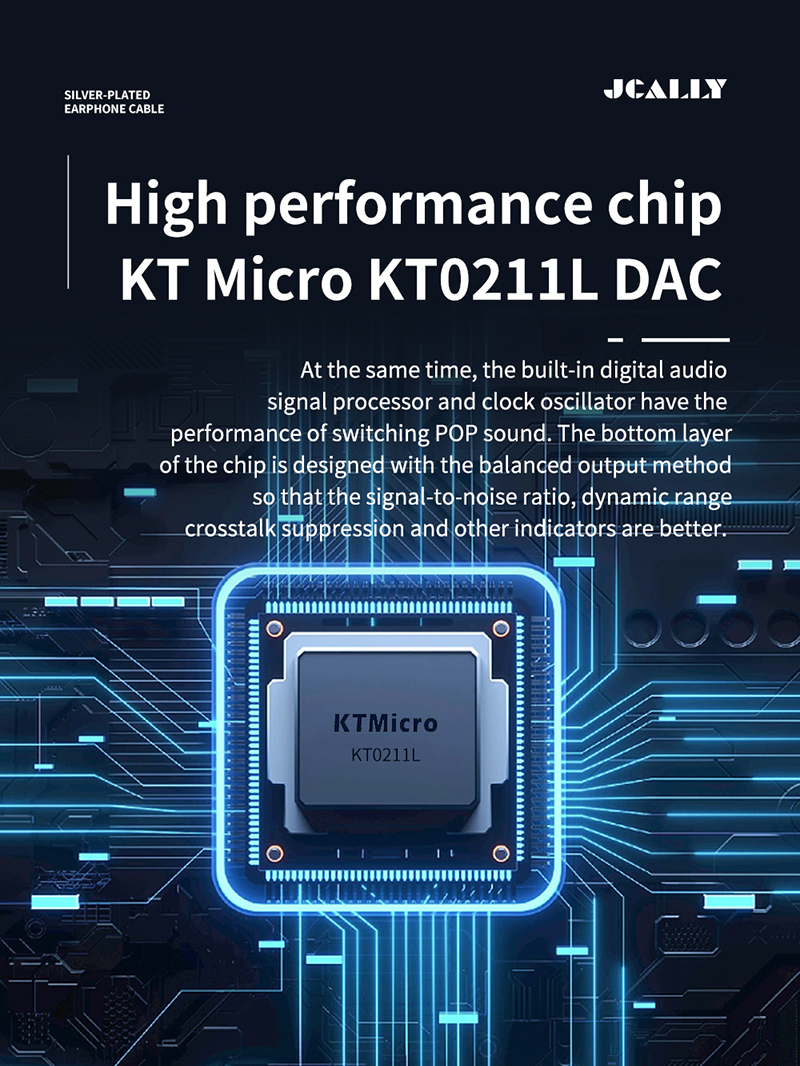 - Enhance your audio experience with the JCALLY PJ3 5N OFC Silver-plated EarphoneCable, engineered for audiophiles and everyday users alike. This high-performance cable features a built-in KT0211L DAC chip, delivering outstanding 24-bit/96kHz audio resolution for clearer, richer sound. Whether you’re listening to music, gaming, or taking calls, this cable provides a professional-grade audio connection.