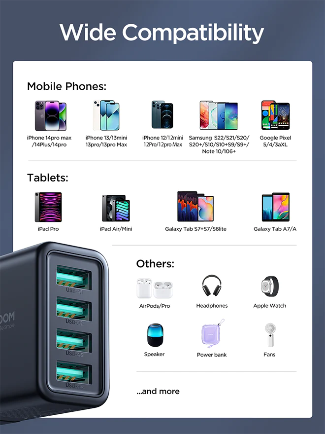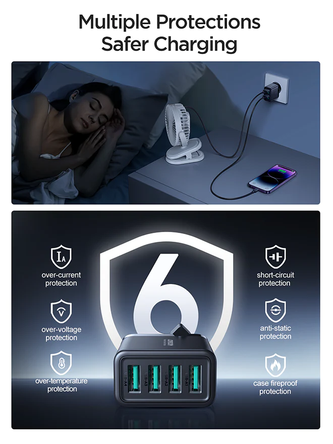 - The Joyroom JR-TCN03 4.8A 4USB Charger in Black (UK) offers a cutting-edge charging solution with a sophisticated design and advanced features. With its four USB ports, this charger stands out by enabling the simultaneous charging of up to four devices, providing unparalleled convenience for users with multiple gadgets. The sleek black finish adds a touch of elegance to its aesthetic.