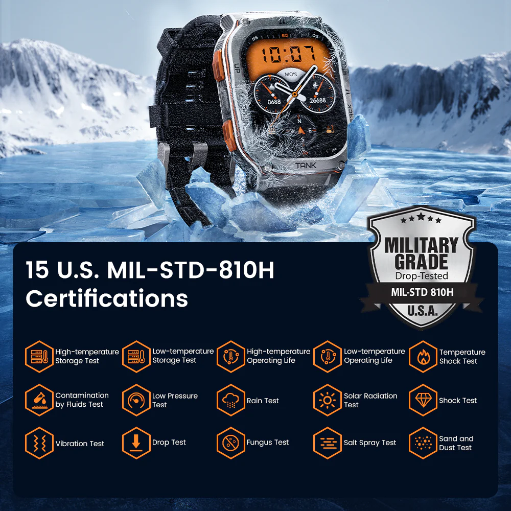 - But it’s not just about navigation; this smartwatch is packed with features to enhance your outdoor experience. Its MIL-STD-810H certification guarantees robustness and durability, making it suitable for any outdoor activity, from hiking in the mountains to swimming in the sea. With 5 ATM and IP69K water resistance, you can dive as deep as 50 meters without worrying about damage.