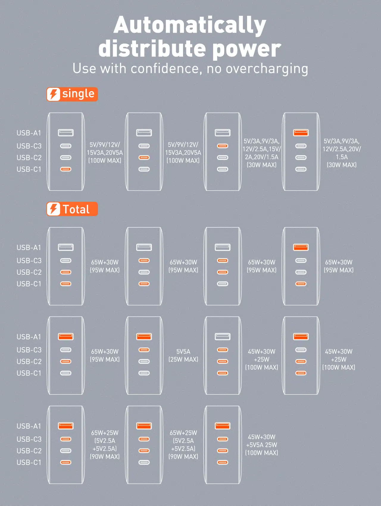 - USB-C3: 5V/9V=3A, 12V=2.5A,15V=2A, 20V=1.5A (30W Max)