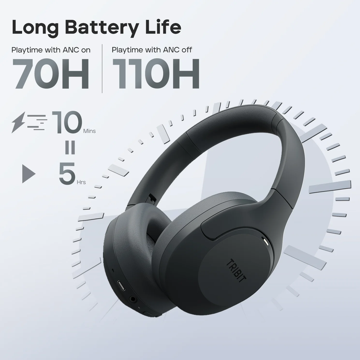 - Battery performance is exceptional. Moreover,The TRIBIT QuietPlus 81 offers up to 110 hours of playtime on a single charge, and up to 70 hours with ANC turned on. In addition, fast charging ensures that just 10 minutes of charging provides up to 5 hours of playback, which is perfect for busy users.