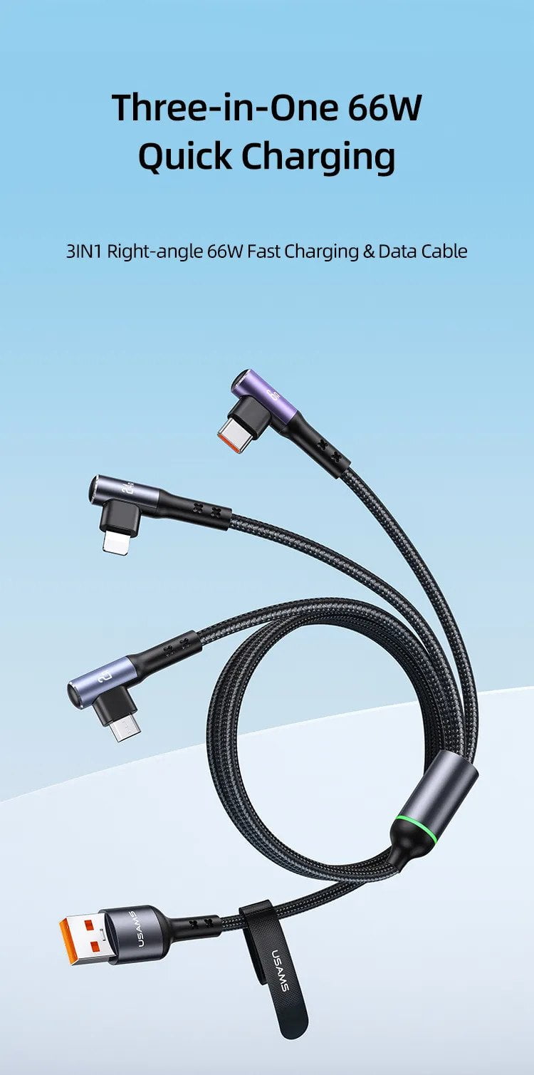 USAMS US-SJ561 U80 3IN1 Right-angle 66W Fast Charging & Data Cable: