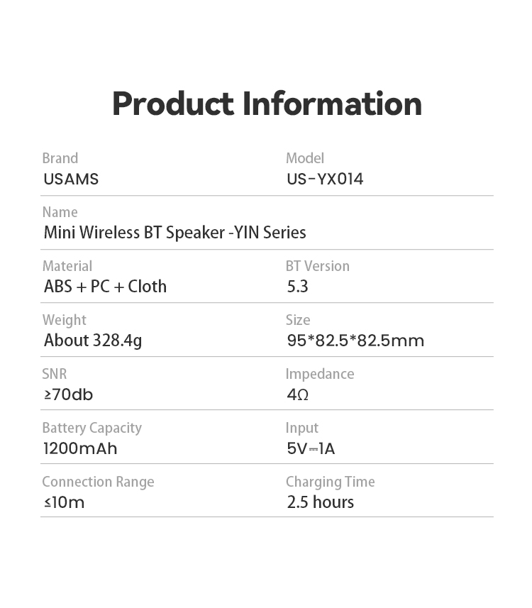 • Introducing the USAMS US-YX014 YIN Series Portable TWS Bluetooth Speaker, a compact audio powerhouse that combines cutting-edge technology with stylish design for an immersive listening experience. Equipped with an advanced Bluetooth 5.3 chip, this speaker ensures a stable and lightning-fast connection, allowing you to enjoy your favorite tunes seamlessly.