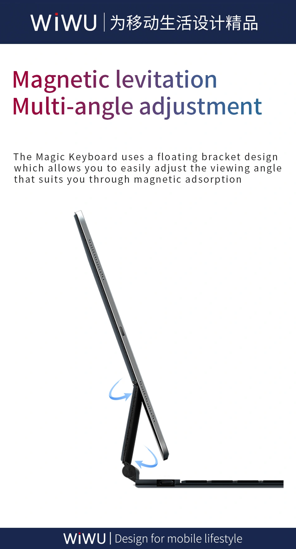- One of the standout features of the WiWU Keyboard is its floating bracket design. This innovative mechanism allows you to effortlessly adjust the viewing angle of your iPad. The magnetic adsorption technology provides a secure hold, ensuring that your iPad stays in the perfect position for your needs.
